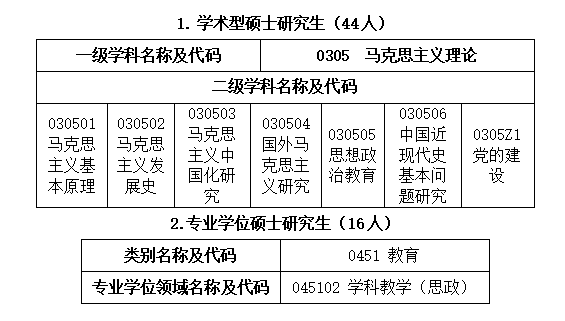 我集团马克思主义理论一级学科下各二级学科点拟接收推荐免试硕士学术型研究生44名,学科教学(思政)专业学位研究生16名,实际招生人数以最后确认录取人数为准。tyc86太阳集团接收2023级推荐免试研究生专业及代码: